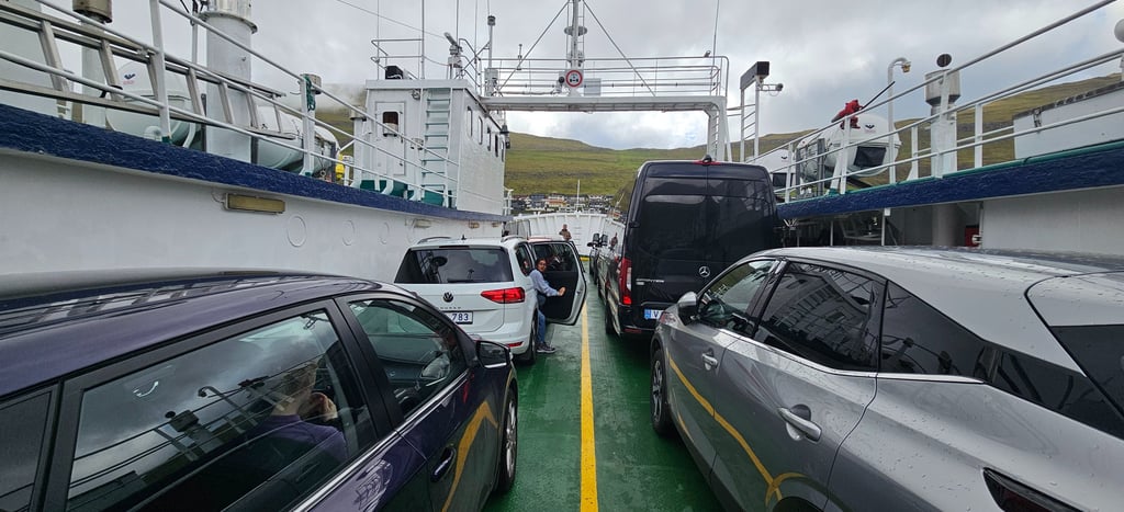 From Klaksvík, we took the ferry to Kalsoy Island, a short but scenic crossing. Driving the car straight onto the ferry made the journey easy, and while we stayed inside the car for most of the ride, we did step out to enjoy the sea views, with mountains rising steeply from the water around us.