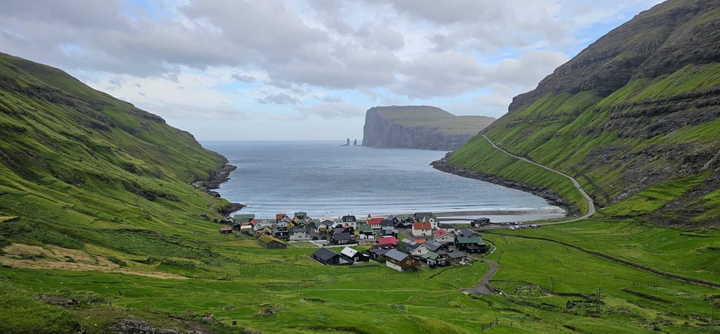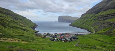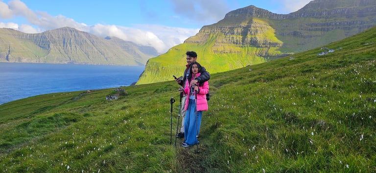 Our journey then led us to the black-sand beach at Tjornuvík, a village nestled serenely between sea and mountains. Its peaceful streets were pristine and quiet, adding to its charm. While Tabasum and Zoya prepared lunch, Ateeq and Zaid trekked up the nearby mountain for a panoramic view of the village. From the top, the sight was absolutely breathtaking. The village resting against the backdrop of the mountains, the dark sands stretching to meet the gentle waves of the sea, and the vast horizon beyond with Risin og Kellingin rising at the end. It was, without a doubt, the most spectacular view we had experienced in the Faroe Islands. The harmony of village calmness, mountain grandeur, and ocean vastness, crowned with the legendary sea stacks, was a scene etched forever in our memory.
