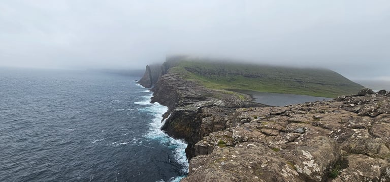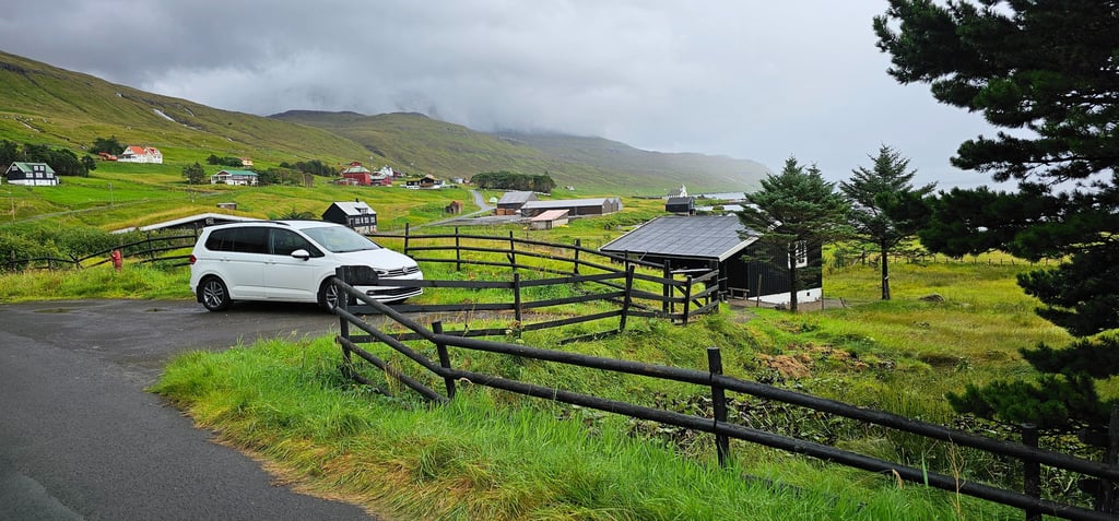 The night before had brought heavy rain, followed by a morning wrapped in dense fog. After a sound sleep and a late breakfast, we left home hoping the weather would clear, but visibility was almost zero, at times we could not see beyond 15 - 20 meters. Driving carefully through the mist, we crossed the narrow rock-guarded causeway connecting Bordoy and Kunoy Islands before reaching the quiet village of Kunoy, where we spent a short while before heading back on to the Klakkur trailhead.