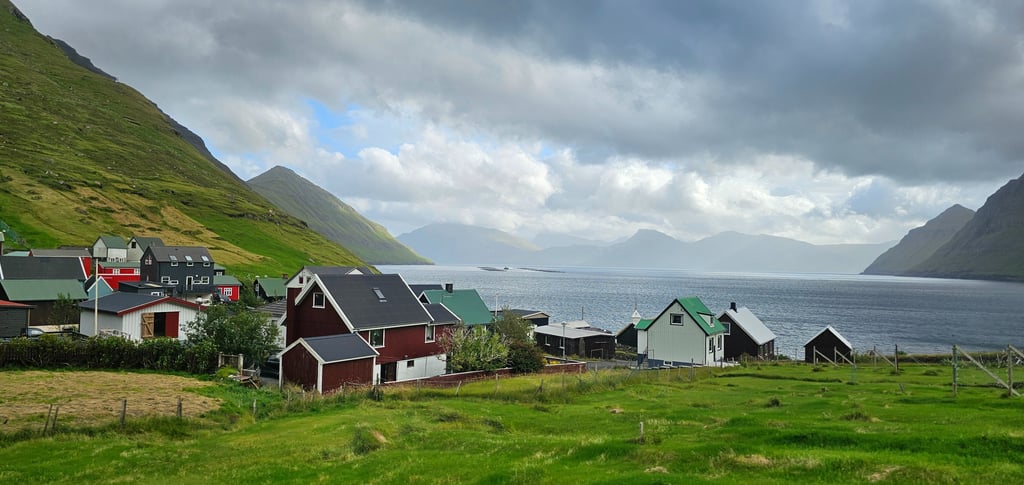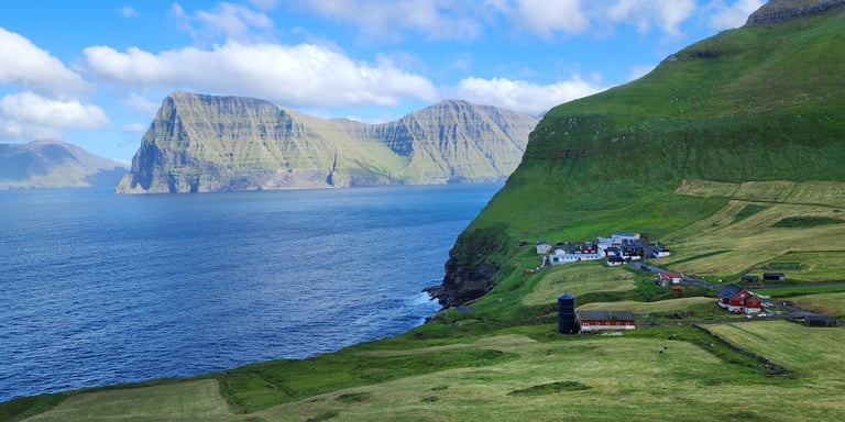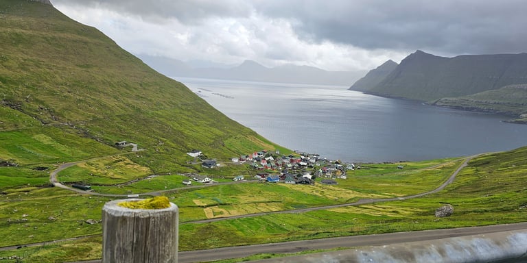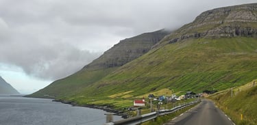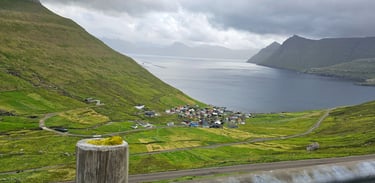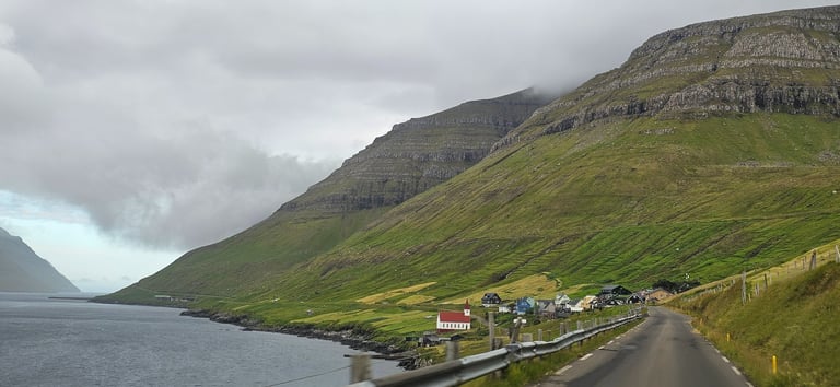 The next day we drove to Funningsfjordur via Skalabotnur and paused briefly to take in the serene beauty of the fjord and its surroundings. From there, we continued our journey to Funningur, a picturesque village framed by towering mountains and the vast ocean beyond. We ventured down into the village to enjoy the view up close, before driving higher up the winding road where the scenery became truly spectacular. The sight from above was so mesmerizing that we stopped three times just to capture photos and videos of the landscape, it was impossible to resist.
