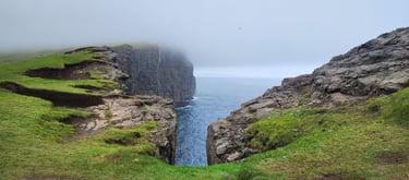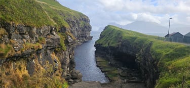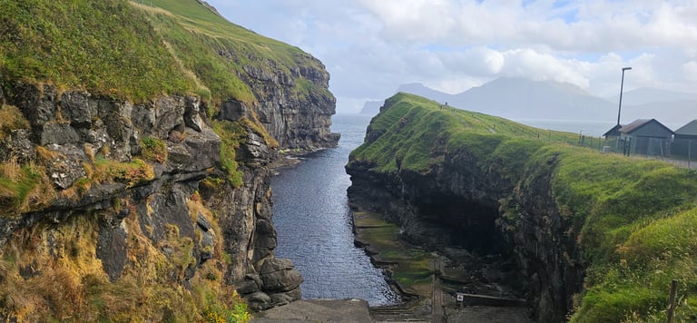 Our next stop was the enchanting village of Gjogv, renowned for its natural gorge that cuts dramatically into the sea. The gorge is a masterpiece of nature, carved over centuries by the relentless Atlantic waves. Standing above it, we were captivated by the narrow channel framed by steep, rugged cliffs, with the deep blue water rushing in and out in a rhythmic dance. The contrast between the lush green slopes surrounding the village and the jagged dark rocks made the view even more striking. We descended into the gorge via the stone stairs, bringing us closer to the water. From below, the scene was even more magical, the gorge felt like a secret doorway to the ocean, echoing with the sound of waves. We took plenty of photos, capturing the raw beauty of the cliffs and the deep channel where fishing boats once sought shelter.