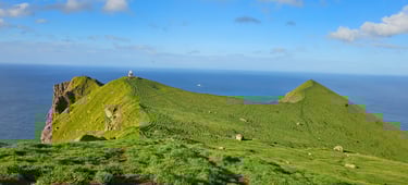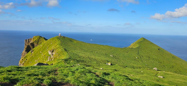 Once on Kalsoy, we drove north toward Trollanes and parked at the cafe where tickets for the Kallur Lighthouse trek are sold and set off on the trail. The hike was longer and steeper than expected, but the unfolding scenery made every step worthwhile. Behind us stretched the fjords and ocean, while ahead, green ridges rolled into the horizon. Sheep grazed lazily on the hillsides, a quintessential Faroese sight. The higher we climbed, the more dramatic the cliffs became, sheer drops plunging straight into the restless Atlantic.