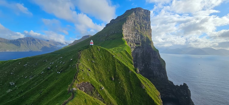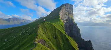 At last, we reached the Kallur Lighthouse, a small white structure perched proudly atop the grassy headland. The view here was unforgettable, ocean and sky colliding at the horizon, mountains looming from the sea, and the lighthouse itself standing as a sentinel against the vast Atlantic. Zoya lingered near the lighthouse, soaking in the panorama and capturing photos, while Ateeq and Zaid pushed further, climbing the last ridge. From that edge, the view was nothing short of iconic, the lighthouse in the foreground, and behind it, the towering bulk of Kalsoy’s cliffs, one of the most photographed images of the Faroe Islands. Standing there, with seabirds overhead and waves crashing far below, was both humbling and exhilarating.