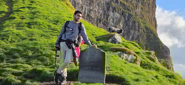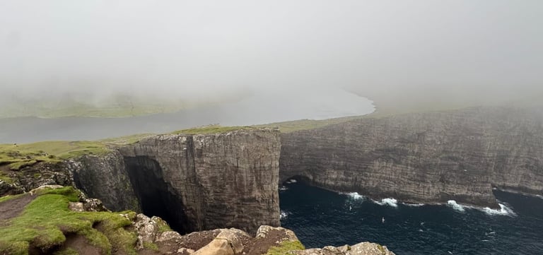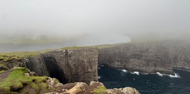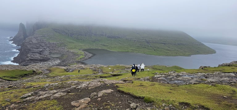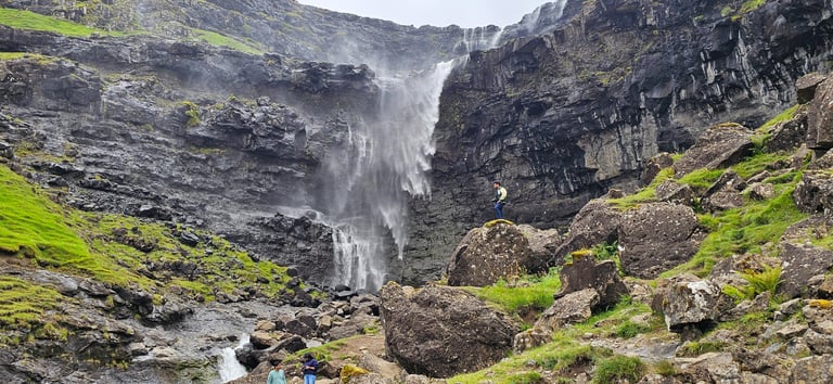 From there, we continued to Fossá, the tallest waterfall in the Faroe Islands. Cascading down steep cliffs, the waterfall roared with immense power. Zaid and Ateeq hiked closer for a better view, where the wind shifted the water sideways, creating a dramatic spectacle. The spray painted the air with mist and rainbows, making the moment unforgettable. Fossa felt alive - constantly changing, never still, each gust of wind reshaping its flow.
