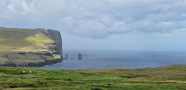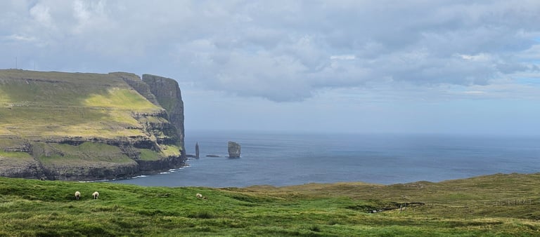 Soon, we arrived at the viewpoint of Risin og Kellingin (“The Giant and the Witch”), the legendary sea stacks rising dramatically from the Atlantic. The cliffs, the crashing waves, and the myth-steeped formations together created a scene both powerful and enchanting. According to folklore, the giant and witch tried to drag the Faroe Islands back to Iceland, but sunlight turned them to stone. The formations, almost human like, seemed to bring the tale to life. With the binoculars placed at the viewpoint, we studied Kellingin more closely, its silhouette resembling a figure standing against the sea.