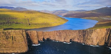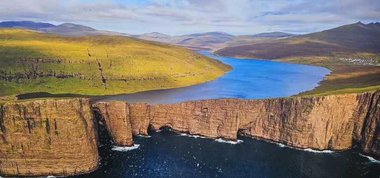 We landed at Vagar Airport at 8pm on 29th August 2025 after a smooth flight from Copenhagen, welcomed by the crisp and refreshing Faroese air as we stepped off the plane. Even before landing, the scenery had already captured our hearts. From the aircraft window, we were treated to a breathtaking view of Lake Sorvagsvatn, the cascading Bosdalafossur Waterfall, and the striking sea stacks of Tindholmur and Drangarnir as the plane descended. The lake appeared to float above the ocean, framed dramatically by towering cliffs and rugged mountains. It was a spectacular welcome to the Faroe Islands, a sight that instantly stirred our excitement for the adventure ahead.