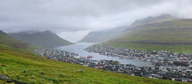 Our trek to Klakkur viewpoint was refreshing and tinged with mystery, as the weather added its own atmosphere to the experience. We parked the car at the gate, though cars could go further, we did not know about it so we walked the steep path on foot. Light drizzle accompanied us as we climbed, and the surrounding peaks disappeared into thick fog. Even Klaksvik, the second largest town in the Faroe Islands, was shrouded in mist, visible yet hazy, like a watercolor painting.