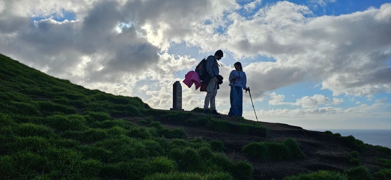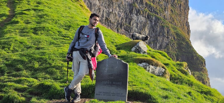 Before heading back, we visited the James Bond headstone, placed near the cliffs to mark the dramatic final scene of No Time to Die (2021), filmed at this very spot. It stands as a symbolic grave for Bond, adding a cinematic layer to the raw beauty of Kalsoy.