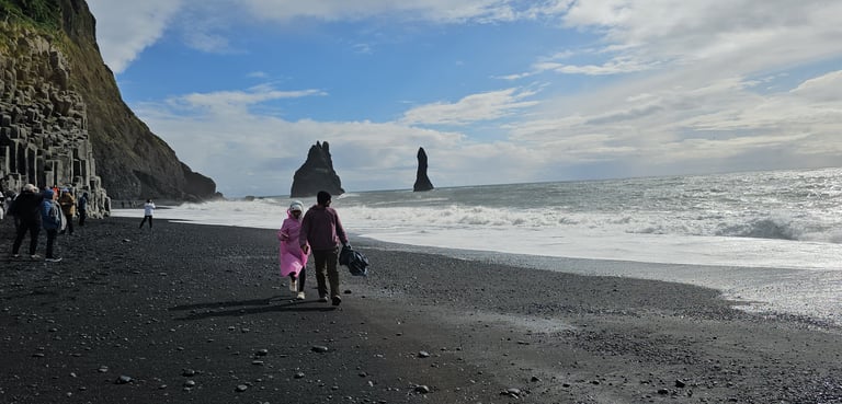 From there, we continued to Reynisfjara Beach, Iceland’s world famous black-sand beach near the village of Vík. The beauty here was wild and raw. The Atlantic waves pounded the shore with relentless power, while the dramatic basalt sea stacks known as Revnisdrangar rose proudly from the ocean. These jagged formations, steeped in folklore, looked like guardians of the coastline. Along the shore, the basalt columns formed perfect hexagonal patterns, resembling a giant organ carved into the cliffs. Nearby, a vast cave added to the dramatic scenery, its stone walls cut so perfectly it seemed impossible they weren’t shaped by human hands, a true creation of nature’s artistry. Standing on the hexagonal basalt columns, with the ocean roaring in the background, we took some of our most memorable photos of the trip.